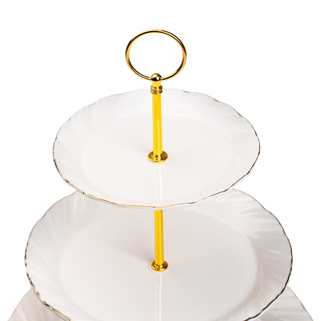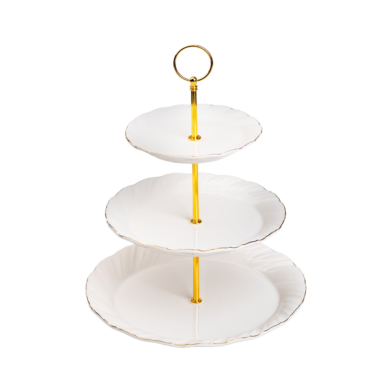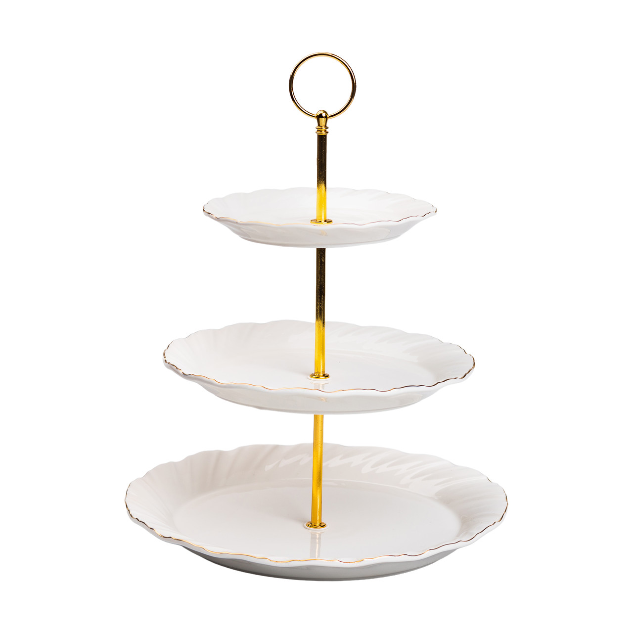 Фуршетна стійка триярусна підставка для закусок, фруктів, цукерок – це елегантний і практичний елемент сервірування. Кожен рівень виготовлений з високоякісного порцелянау та підтримується міцною металевою основою. Основні характеристики висота 33 см; діаметр нижньої тарілки 26 см; діаметр середньої тарілки 21 см; діаметр верхньої тарілки 15.5 см. Кожен рівень може використовуватися для подачі різних видів фруктів, цукерок або інших закусок, що робить цю підставку ідеальним вибором для будь-якого свята чи вечірки. Її елегантний дизайн надасть шарму вашому столу. Така фруктовниця є не лише практичним предметом для сервірування, а й декоративним елементом, що привертає увагу та створює затишну атмосферу на будь-якому заході чи вечері.