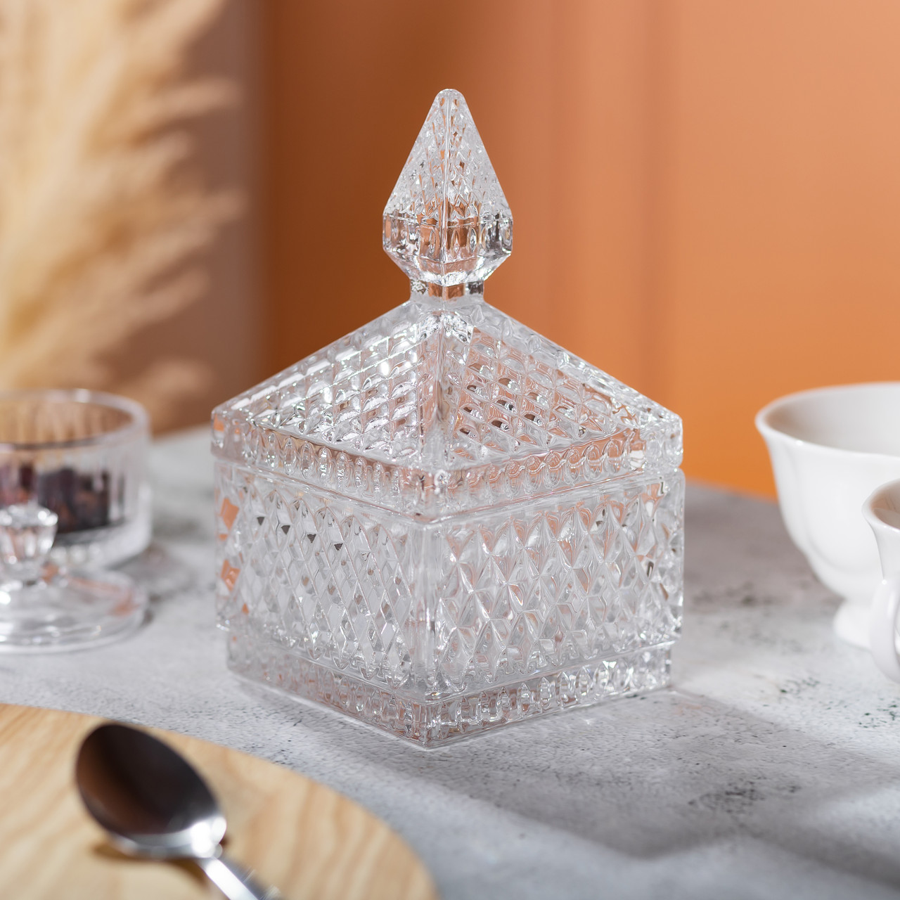 Квадратна цукерниця з кришкою із скла у східному стилі – це вишуканий та стильний елемент для зберігання солодощів або маленьких частування. Її унікальний дизайн, натхненний східною естетикою, надає екзотичному шарму та розкоші будь-якого інтер’єру. Виготовлена з високоякісного скла, цукерка відрізняється блиском та елегантністю, а квадратна форма та деталі у східному стилі роблять її неперевершеним декоративним акцентом. Основні характеристики: Матеріал: скло; Ширина: 8.5 см; Довжина: 8.5 см; Висота: 15 см. Цей виріб ідеально підходить для святкових подій або створення особливої атмосфери в інтер’єрі вашого будинку. Кришка надає додаткової зручності, зберігаючи свіжість вмісту та надаючи можливість естетично подати солодощі. Завдяки своєму оригінальному дизайну, ця цукерка також стане чудовим подарунком для любителів унікальних та екзотичних предметів. Це не просто функціональний предмет, а й відмінний акцент для вашого сервірування або як частина декору для дому, що створює атмосферу розкоші та витонченості.