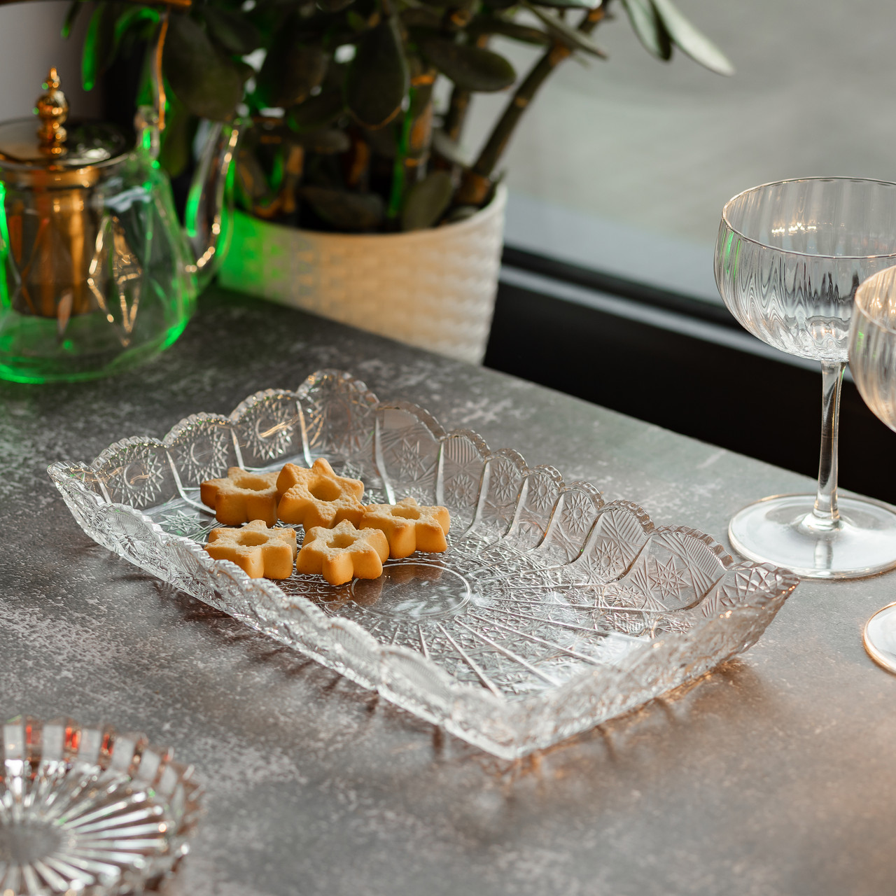 Прямокутне скляне Блюдо для закусок – стильне і практичне рішення для подачі свіжих фруктів або інших закусок. Його елегантний прямокутний дизайн додає сучасного вигляду сервіровці, роблячи її універсальним вибором для будь-якого святкового або повсякденного столу. Прозоре скло дає змогу красиво демонструвати фруктову композицію, підкреслюючи яскравість і натуральну красу продуктів. Основні характеристики: Матеріал: скло; Розмір: 28.6х16.5х3 см; Форма: прямокутна. Блюдо для закусок ідеально підходить для використання на святкових заходах, сімейних обідах або як декоративний елемент на журнальному столику. Легкість у догляді та стильний вигляд роблять її не тільки практичною, а й привабливою частиною будь-якого інтер’єру. Завдяки своїй формі та розмірам, ця тарілка дає змогу розмістити на ній різноманітні закуски, додаючи вашому столу елегантності та свіжості.
