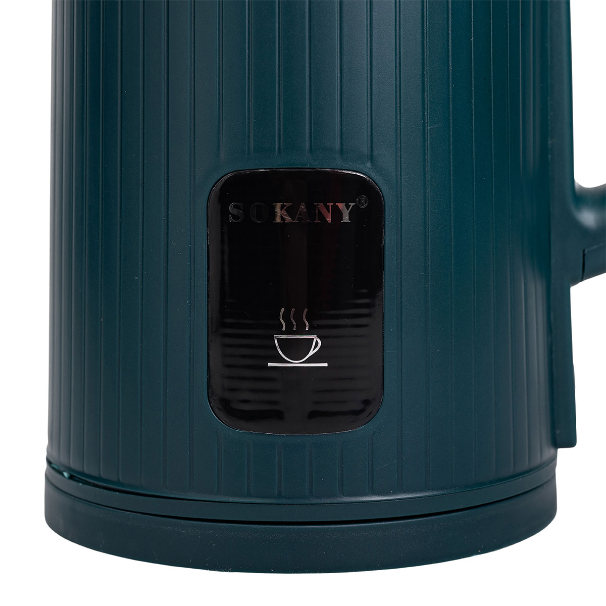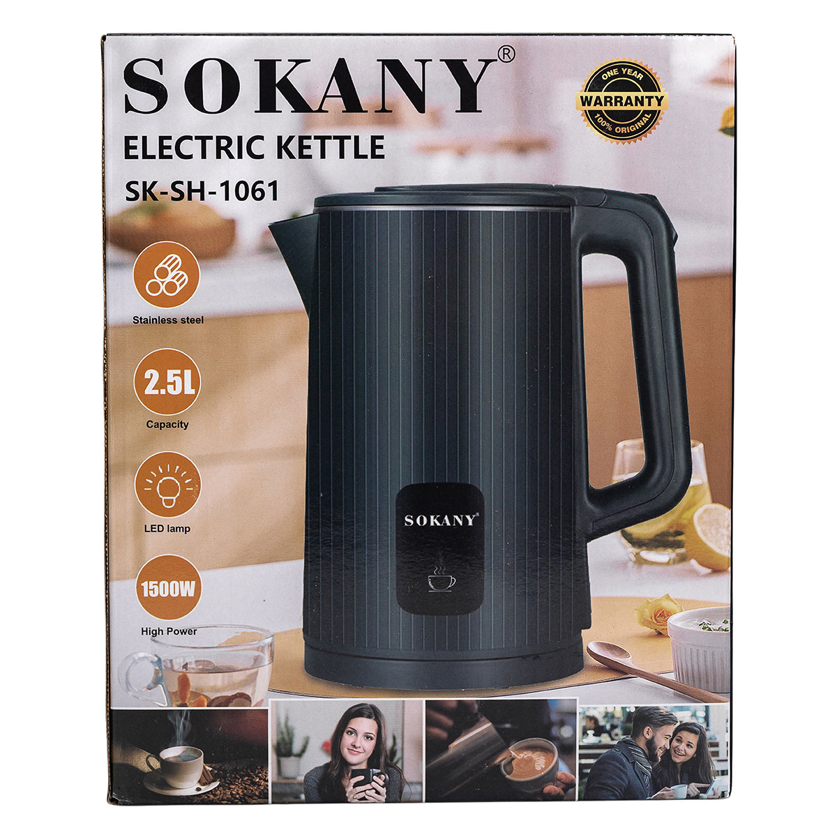 Електрочайник Sokany – практичний і зручний пристрій, який дає можливість за лічені хвилини закип’ятити воду і стане стильним доповненням будь-якої кухні. Чайник відрізняється оптимальним об’ємом для приготування гарячих напоїв для всієї родини, має дисковий нагрівальний елемент та поворотну основу. Основні характеристики електрочайника об’єм 2,5 літра; потужність 1500 Вт; дисковий нагрівальний елемент. Особливості електричного чайника Авто відключення під час зняття з підставки. Захист від увімкнення без води. Захист від перегріву. Чайник виготовлений із безпечних матеріалів, має захист від включення без води та зручну ручку, яка не нагрівається та забезпечує захист від опіків. Закритий нагрівальний елемент гарантує тривалий термін служби та просте очищення від накипу.