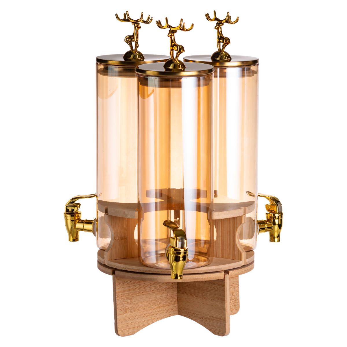 Вишукана скляна лимонадниця 3в1 об’ємом 5.5 літра — ідеальний вибір для стильної подачі напоїв на фуршетах, банкетах, вечірках та домашніх зустрічах. Три окремі ємності дозволяють подавати відразу кілька видів напоїв, фруктової води чи домашнього лимонаду. Декоративні кришки із золотими оленями та краники під золото надають сервіруванню преміального та святкового вигляду. Міцна дерев’яна підставка робить конструкцію стійкою та естетичною. Характеристики лимонадниці 3в1 загальний об’єм: 5.5 літра; кількість ємностей: 3 шт.; об’єм однієї колби: ~1.83 л; діаметр кожної ємності: 9.5 см; загальний діаметр лимонадниці: 21 см; висота кришками: 40 см; матеріал колб: термостійке скло; матеріал кришок та кранів: метал із золотистим покриттям; підставка: натуральне дерево, поворотна конструкція. Лимонадниця відмінно підійде для соків, компотів, води з цитрусами, ягідних напоїв та авторських настоянок. Кожна ємність має власний кран, що забезпечує зручність використання. Поворотна дерев’яна основа полегшує доступ до будь-якої з ємностей та робить подачу максимально комфортною. Переваги лимонадниці на 3 секції 3 окремі колби — подання різних напоїв в одному оформленні. Преміальний зовнішній вигляд — ефектні золоті кришки з оленями та фурнітура. Термостійке скло — зберігає смак напоїв, легко миється. Компактна кругла форма — займає мінімум місця на столі. Ідеальна для заходів, кейтерингу, кафе та подарунків. Купити скляну лимонадницю 3в1 із золотими деталями та дерев’яною підставкою можна з доставкою по всій Україні. Безпечна упаковка гарантує безпеку під час транспортування. Перетворіть кожну подачу напоїв на подію.