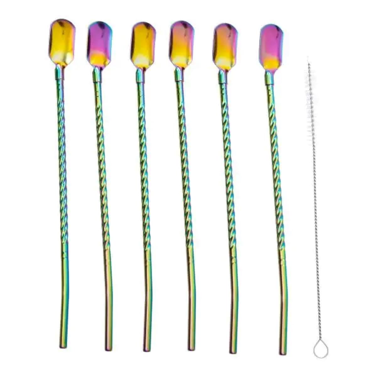 Набір багаторазових ложок-трубочок 6 шт для напоїв 22 см зі щіткою для миття з нержавіючої сталі Хамелеон HP-20-21