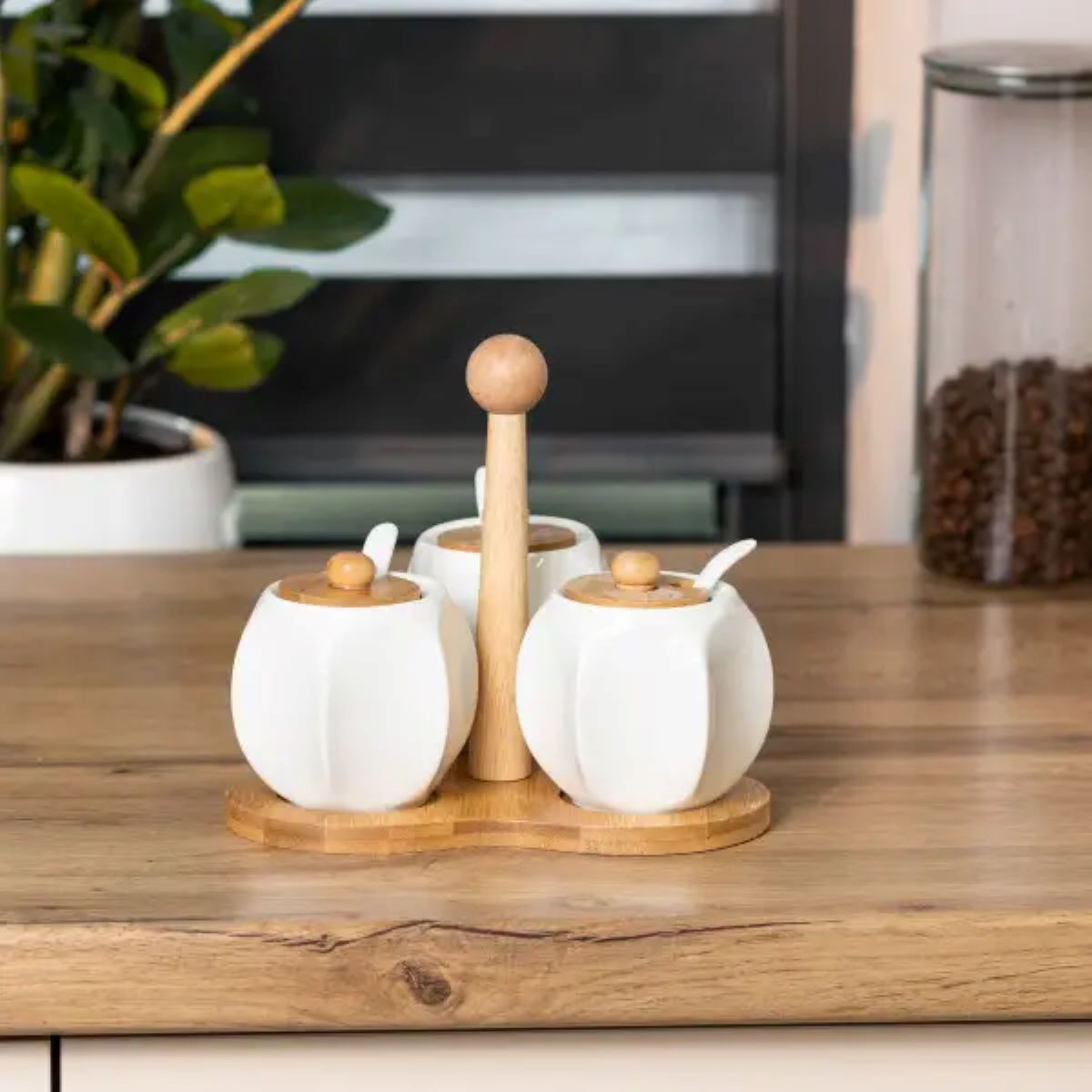 Стильний набір для сипучих продуктів стане чудовим доповненням вашої кухні, поєднуючи в собі функціональність, елегантність та зручність. У комплект входять три керамічні баночки, кожна з бамбуковою кришкою та керамічною ложечкою, а також бамбукова підставка, яка зручно вміщує всі три баночки. Характеристики: Матеріал банок: Кераміка Матеріал підставки: Бамбук Об’єм баночок: 0.2 л Переваги: Керамічні баночки: Виготовлені з високоякісної кераміки, баночки забезпечують довговічність і збереження смаку та аромату спецій. Кераміка легко миється та не взаємодіє з вмістом, гарантуючи чистоту смаку. Бамбукові кришки: Щільно закриваються, захищаючи вміст від вологи та пилу, що допомагає зберігати спеції свіжими та ароматними. Керамічні ложечки: У кожній баночці є керамічна ложечка, що забезпечує зручне та чисте використання спецій без потреби в окремих ложках. Бамбукова підставка: Додає естетичної привабливості та забезпечує організоване зберігання баночок. Підставка допомагає підтримувати порядок на кухні та забезпечує легкий доступ до спецій. Легкість у догляді: Всі елементи набору можна мити в посудомийній машині, що спрощує їх обслуговування. Цей набір не лише організовує ваш кухонний простір, але й додає нотку елегантності, ставши чудовим доповненням для будь-якої кухні.