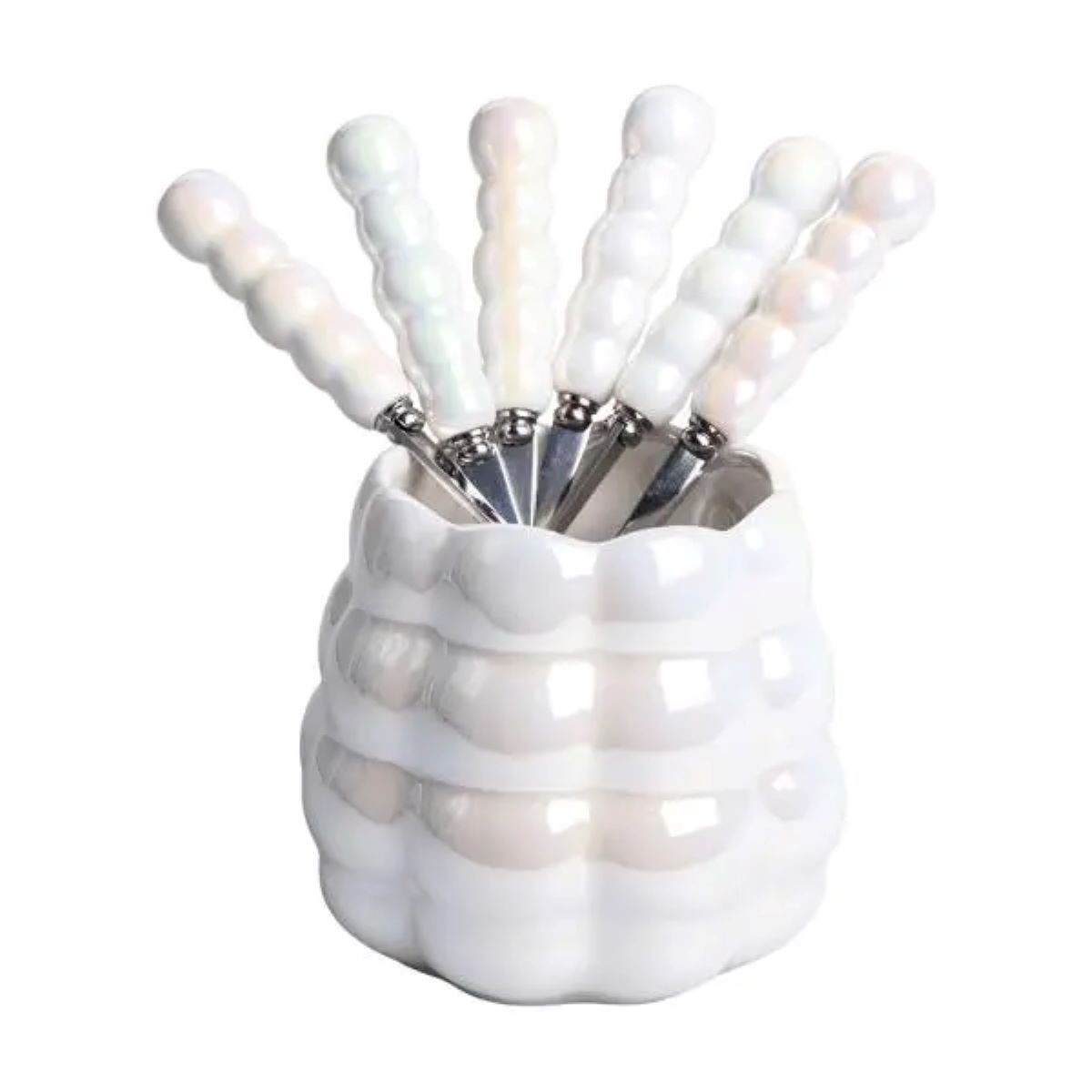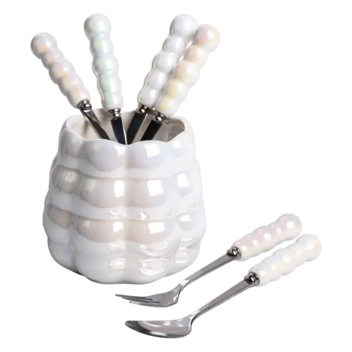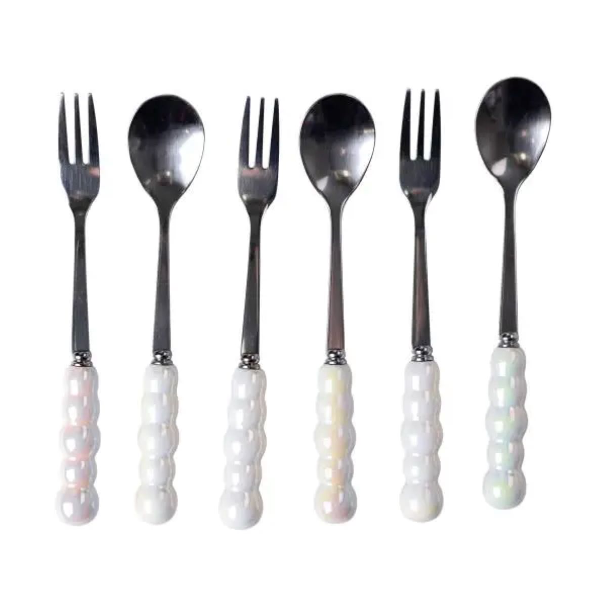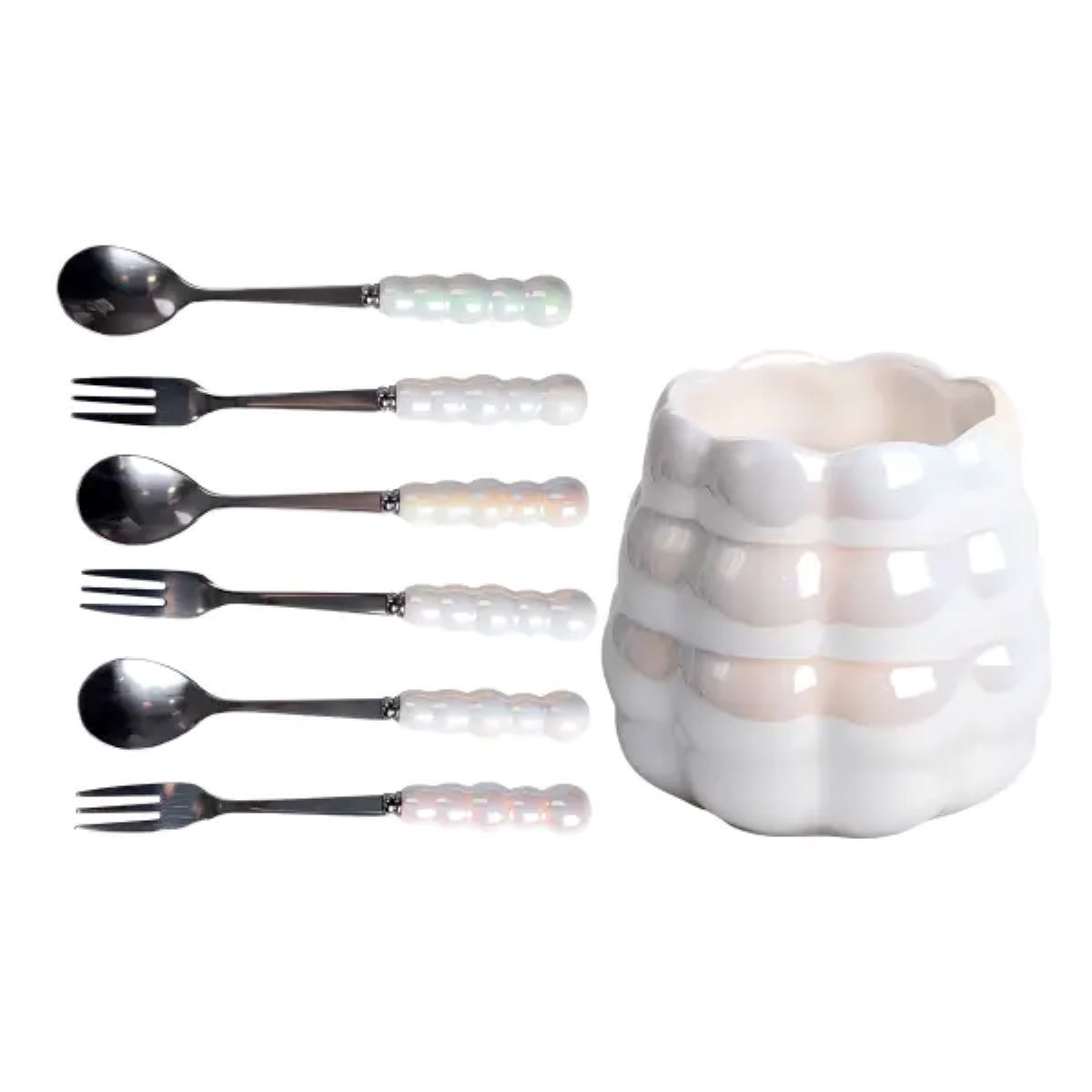 Набір десертних виделок і ложок на 3 персони з підставкою з порцелянау 7 предметів Перламутровий HP-20-62