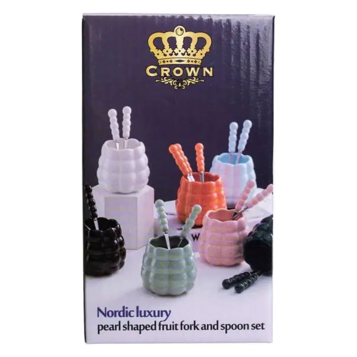 Набір десертних виделок і ложок складається з приладів, виготовлених із нержавіючої сталі, з порцеляновими ручками, оформленими у вигляді перлин. Поєднання матеріалів забезпечує міцність виробів і естетичний вигляд. Гладка поверхня сталі сприяє зручному використанню та легкому догляду. Основні характеристики: Кількість предметів у наборі: 7 шт; Кількість персон: 3; Матеріал приладів: нержавіюча сталь, порцеляна; Матеріал підставки: порцеляна; Упаковка: коробка; Розміри: висота підставки: 7 см; довжина десертної ложки: 14.5 см; довжина десертної виделки: 14.5 см. Форма ложок і виделок адаптована для вживання десертів, забезпечуючи комфорт під час трапези. порцелянові ручки мають гладку структуру, що надає приладам характерного зовнішнього вигляду. Конструкція ручок передбачає надійне зчеплення з металевою частиною, що мінімізує ризик пошкоджень під час експлуатації. Набір доповнено порцелянаовою підставкою, яка слугує для зручного зберігання приладів. Підставка відповідає загальному дизайну комплекту і забезпечує організоване розміщення предметів на столі або в зоні сервірування.