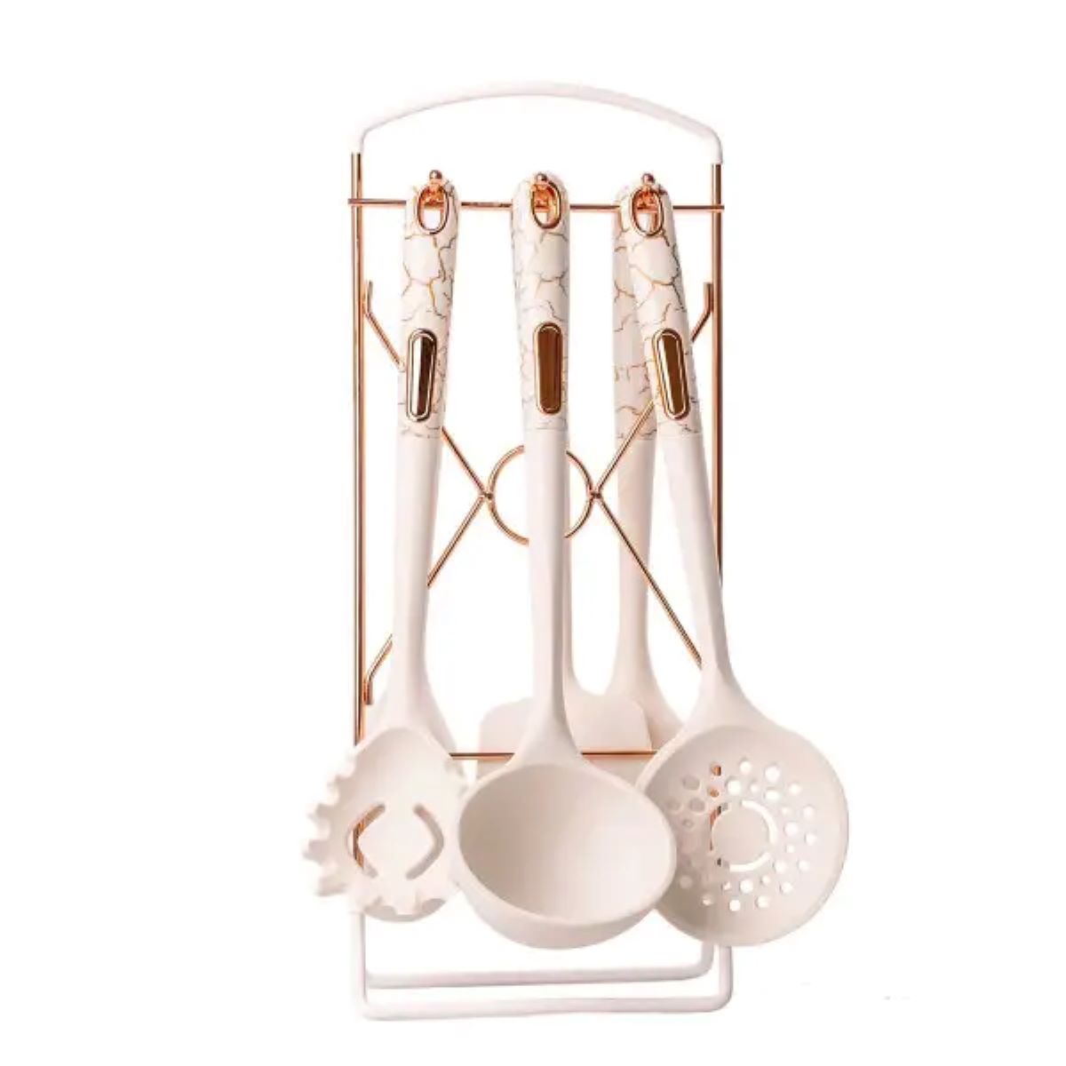 Набір кухонного приладдя на підставці включає шість стильних аксесуарів у мармуровому дизайні: ополоник, кухонні лопатки, кухарську ложку, шумівку, ложку для спагетті. Цей елегантний комплект має сучасний вигляд і приємний на дотик матеріал, що надає кухні стильного акценту. Характеристики: Матеріал: харчовий пластик, силікон Включає: ополоник, кухонні лопатки, кухарську ложку, шумівку, ложку для спагетті, підставку Розмір приладів: 32,5 см Переваги: Елегантний дизайн: сучасний мармуровий вигляд, що підкреслює стиль вашої кухні. Функціональність: зручна підставка для організації та легкого доступу до інструментів. Приємні на дотик матеріали: забезпечують комфорт під час використання. Догляд: Не мийте приладдя в посудомийній машині Використовуйте м’які миючі засоби Ретельно висушуйте після миття Зберігайте у сухому місці