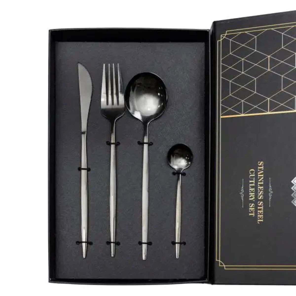 Набір столових приборів містить 24 предмети, призначені для обслуговування 6 персон. До комплекту входять 6 столових ложок, 6 чайних ложок, 6 виделок і 6 столових ножів. Основна частина приладів має золотистий відтінок, а ручки виконані в чорному кольорі, що створює контрастний і стриманий вигляд. Основні характеристики: Кількість предметів у наборі: 24 шт; Кількість персон: 6; Матеріал: нержавіюча сталь; Упаковка: коробка; Розміри приладів: довжина столового ножа: 22.5 см; довжина столової ложки: 20.8 см; довжина столової виделки: 21.5 см; довжина чайної ложки: 12.8 см. Комплектація набору: столовий ніж: 6 шт; столова ложка: 6 шт; столова виделка: 6 шт; чайна ложка: 6 шт. Матеріалом виготовлення є нержавіюча сталь, яка забезпечує стійкість до корозії та механічних пошкоджень. Поверхня гладенька, що полегшує очищення та догляд. Чорні ручки мають ергономічну форму, що сприяє зручному захопленню та комфортному використанню. Комплект підходить як для щоденного застосування, так і для сервірування святкового столу. Завдяки поєднанню золотистої сталі з чорними ручками, прилади гармонійно вписуються в сучасний інтер’єр кухні та можуть комбінуватися з різними видами посуду.