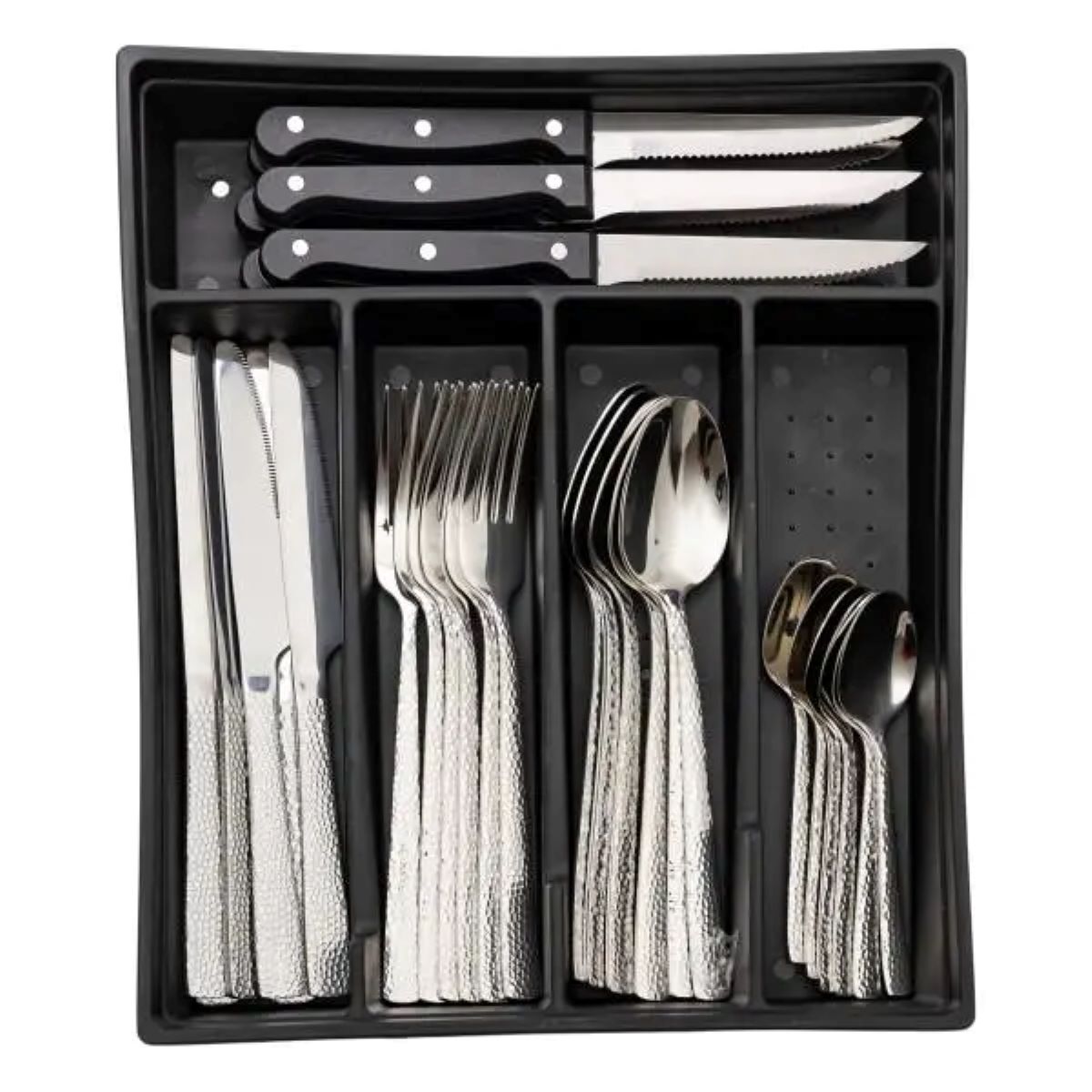Набір столових приборів у футлярі розрахований на 6 персон і містить 30 предметів: 6 столових ложок, 6 чайних ложок, 6 виделок, 6 столових ножів і 6 ножів для стейків. Комплект забезпечує повний набір необхідних приладів для сервірування столу, включно зі спеціальними ножами для зручної нарізки м’яса. Завдяки зручному футляру всі предмети зберігаються в одному місці, що допомагає підтримувати порядок і захищає їх від пошкоджень. Основні характеристики: Кількість предметів у наборі: 30 шт; Кількість персон: 6; Матеріал: нержавіюча сталь, кухонний ніж (ручка) – пластик;; Упаковка: коробка; Розміри приладів: довжина столового ножа: 23 см; довжина кухонного ножа: 23 см; довжина столової ложки: 20.5 см; довжина столової виделки: 21 см; довжина чайної ложки: 14 см. Комплектація набору: столовий ніж: 6 шт; кухонний ніж: 6 шт; столова ложка: 6 шт; столова виделка: 6 шт; чайна ложка: 6 шт. Прилади виготовлені з неіржавкої сталі, що забезпечує міцність, стійкість до корозії та довговічність. Полірована поверхня надає їм привабливого вигляду і полегшує очищення. Ергономічна форма забезпечує зручний хват, а ножі для стейків мають загострені леза для легкого розрізання м’ясних страв. Комплект ідеально підходить як для щоденного використання, так і для особливих випадків. Футляр робить його зручним для зберігання і транспортування, що може бути корисним для виїздів або подарункових наборів. Усі предмети легко миються вручну або в посудомийній машині, зберігаючи свій вигляд і функціональність.