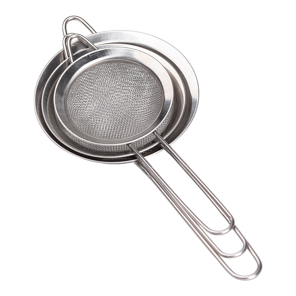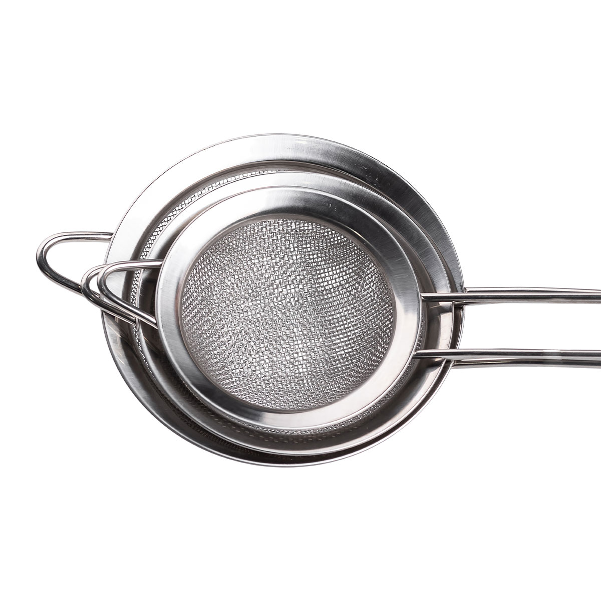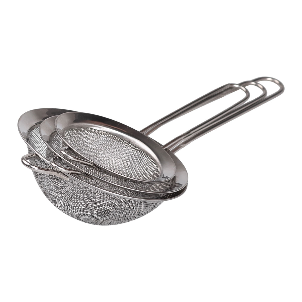 Набір ситечок з нержавіючої сталі – універсальне і практичне доповнення кухонного начиння. Аксесуари мають різний діаметр і можуть використовуватися для різноманітних процесів, серед яких просіювання борошна та інших дрібнодисперсних продуктів, протирання фруктових і овочевих пюре, соусів, заварювання чаю. Основні характеристики набору ситечок розмір великого сита 28,5×12×4 см; розмір середнього сита 25×10×4 см; розмір маленького ситечка 21,5×8×4 см; матеріал – нержавіюча сталь. Ситочки виготовлені з нержавіючої сталі, легко миються під проточною водою і не займають багато місця на кухні. Для зручності використання передбачена довга ручка і широкий обідок з петелькою для підвішування.