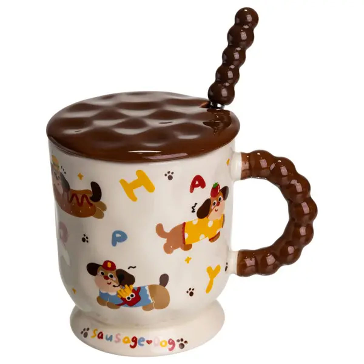 Новорічна порцелянова чашка “Весела Такса” з кришкою та ложкою 400 мл, Святкова кружка чашка для дітей на подарунок FM-17B