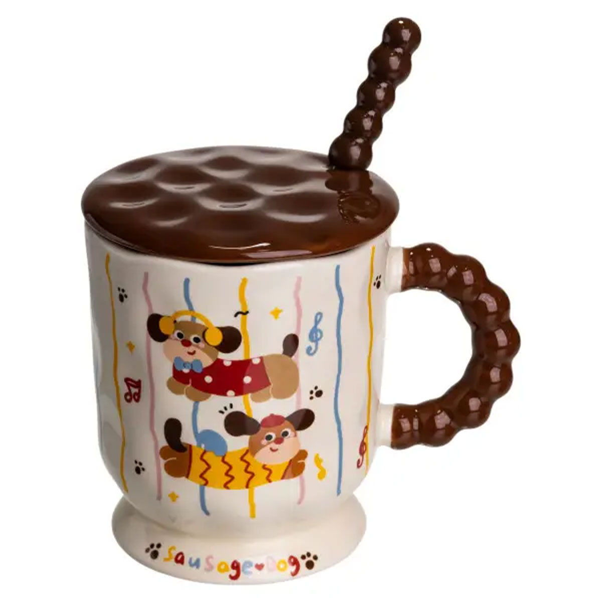 Новорічна порцелянова чашка “Весела Такса” з кришкою та ложкою 400 мл, Святкова кружка чашка для дітей на подарунок FM-17C