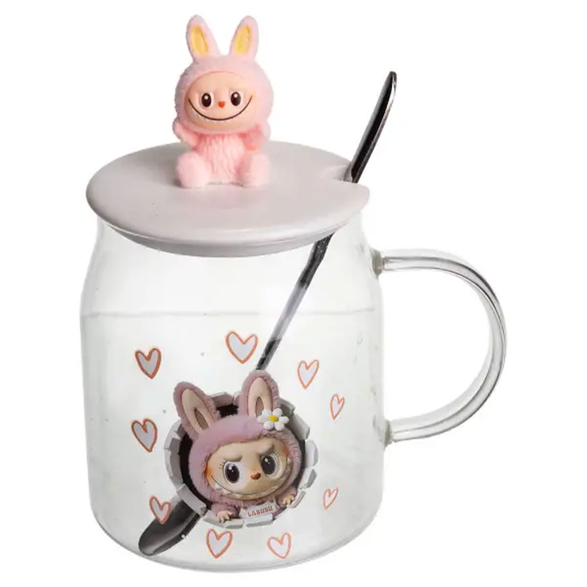 Новорічна велика скляна чашка “Лабубу” з кришкою та ложкою 600 мл Рожевий FM-56B